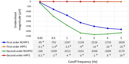 - The ST-segment deviation caused by high-pass filters significantly exceeds the ±25 μV limit, even at the monitoring cutoff frequency of 0.5 Hz, reaching up to −125 μV and −240 μV for the first- and second-order RCHPF, respectively. In contrast, the inverse HP filters substantially reduce ST-segment deviation, keeping the maximum deviation of any lead below 5 μV even at cutoff frequencies as high as 5 Hz—ten times higher than the monitoring setting. Thus, the ST-segment deviation with IHPF is comparable to that of a diagnostic first-order RCHPF (0.05 Hz), which we measured for the standard signal ANE20000 (leads I, II, and V1–V6) to have a mean value of −2.8 μV, with a minimum–maximum range of (−13 μV to +12 μV).