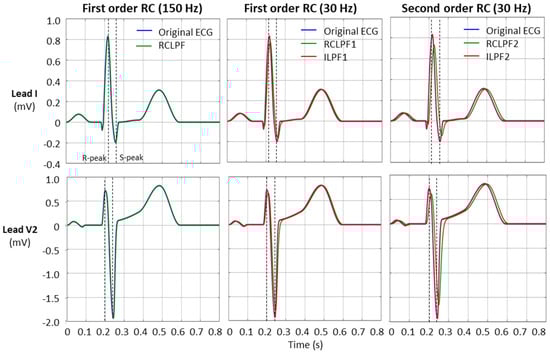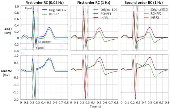 - Isaksen, J.; Leber, R.; Schmid, R.; Schmid, H.; Generali, G.; Abächerli, R. The first-order high-pass filter influences the automatic measurements of the electrocardiogram. In Proceedings of the 2016 IEEE International Conference on Acoustics, Speech and Signal Processing (ICASSP), Shanghai, China, 20–25 March 2016; pp. 784–788. [Google Scholar] [CrossRef]