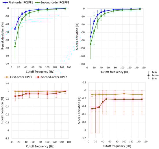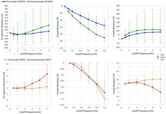 - The effect of high-pass filters on other ECG waves includes a reduction in the amplitude of the positive R-peak, showing negative deviations ranging from −3.6% to −28% (mean values) and up to −4.5% to −32% (maximum deviations). Additionally, high-pass filters overdamp the negative S-peak, causing positive deviations from 7% to 45% (mean values) and up to 119% to 355% (maximum deviations). In contrast, the inverse high-pass filters substantially reduce R-peak deviations to below −3.5% and S-peak deviations to below ±2%, even at the highest cutoff frequency of 5 Hz. These results remain well within the recommended deviation limit of ±5% [17].