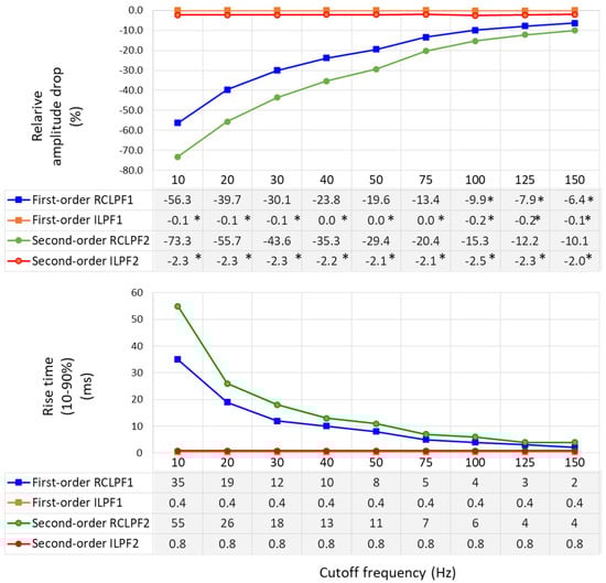 - Square test impulse: The rise time, defined as the time required for the filtered signal to transition from 10% to 90% of the rising edge, is a common metric in signal processing used to assess filter performance. Although no specific limits are established for this metric in ECG signal processing, we report it here for completeness and comparative analysis. The same square test impulse (3 mV, 100 ms) used for the high-pass filter evaluation in Section 3.1 is applied.