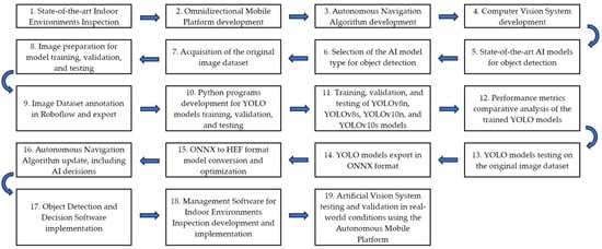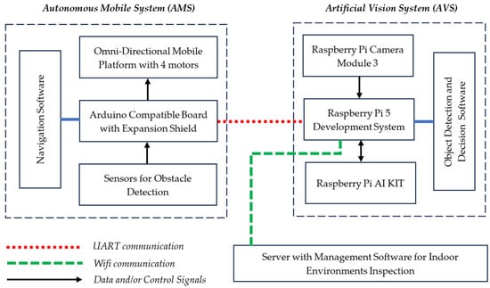 Another key contribution is the flexible system architecture, which allows for seamless adaptation to different mobile inspection platforms. The selection of the AI accelerator is driven by the necessity of implementing the artificial vision system on an embedded system capable of being integrated into an autonomous mobile platform. The system’s flexibility is ensured by its high mobility, allowing the same equipment to be deployed across various locations while maintaining operational efficiency, enabling rapid, easily configurable, and customizable inspection processes tailored to the specific characteristics of different indoor environments.