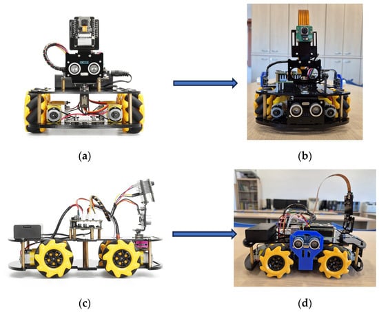 The autonomous mobile platform used for indoor environment inspection. (a) Tscinbuny ESP32 Robot for Arduino Uno—front view [13]; (b) modified platform—front view; (c) Tscinbuny ESP32 Robot for Arduino Uno—lateral view [13]; and (d) modified platform—lateral view.