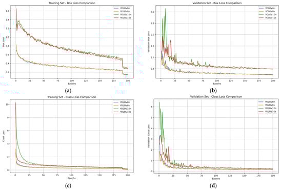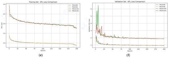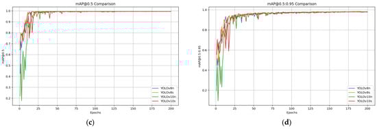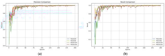 The differences in box loss and DFL loss trends are more pronounced between YOLOv8 and YOLOv10. These differences can be attributed to the two models’ architectural modifications and training process variations. YOLOv10 has architectural changes compared to YOLOv8 regarding the backbone network, feature extraction, and loss function computation. These changes may introduce variations in how the models learn bounding box regression. YOLOv8n, for example, starts with a relatively low box loss value (0.70299 in epoch 1), decreases steadily, and reaches very low values in later epochs, with a final loss of 0.14613 at epoch 200. This trend indicates fast and stable convergence. YOLOv10n starts with a higher box loss (1.30431 in epoch 1), indicating that the initial predictions are worse than those of YOLOv8n. The box loss decreases slower in the early epochs but eventually catches up, achieving a final loss of 0.29594 at epoch 200. This case suggests slower convergence and a more complex loss function or learning process.
