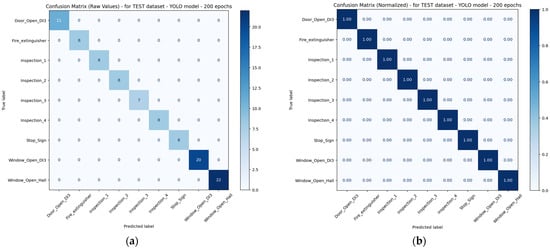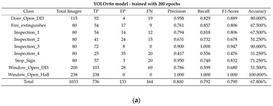 Window_Open_Hall and Door_Open_DI3 involve more complex objects, because various other items can appear behind glass windows or door frames, making their classification particularly challenging. The lower accuracy obtained for these classes can also be attributed to the fact that these objects are only partially visible in the images captured by the camera at the current height of the autonomous mobile platform. Repositioning the camera to capture the entire object within the image would improve the detection results. Therefore, future development will focus on either positioning the camera on a higher support to ensure that objects of interest are fully captured within the frame or introducing a scanning mode where the camera is oriented horizontally and vertically. However, the latter approach would complicate the platform’s navigation algorithm.