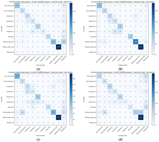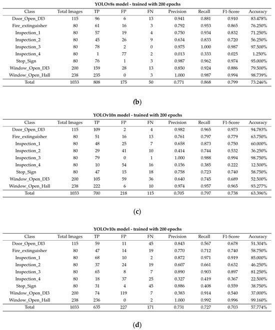 YOLOv10 introduces further optimizations focusing on a higher accuracy and robustness for complex tasks. However, its complexity and some trade-offs between performance and real-time speed may negatively affect the detection of small or occluded objects, as observed for models like YOLOv10n and YOLOv10s. YOLOv10n’s architecture struggles with objects such as Door_Open_DI3 and Window_Open_Hall.