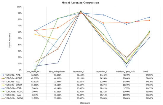 YOLOv8n consistently demonstrated the highest accuracy across both datasets, achieving 83.607% on the VAL dataset and 78.689% on COCO. It showed a strong performance in all classes, especially Inspection_1 and Inspection_3. YOLOv10n had a moderate performance with a 61.475% accuracy on VAL and 61.066% on COCO, but it struggled with some classes, particularly Window_Open_Hall and Door_Open_DI3. YOLOv8s and YOLOv10s showed a significant drop in accuracy on both datasets, with a 59.836% accuracy for YOLOv8s on both datasets and 51.230% on VAL and 56.967% on COCO for YOLOv10s. Both small models had difficulties in detecting more complex objects like Fire_extinguisher and Window_Open_Hall.