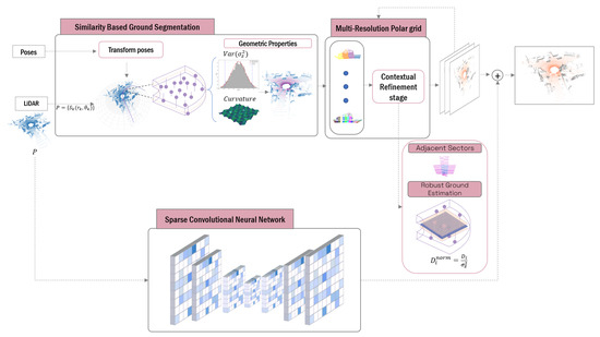 The method proposed in this article primarily falls within the geometric approaches category, with a secondary emphasis on machine learning paradigms through the use of a sparse neural network to overcome the sensitivity of geometric approaches to sparse data as point clouds. Specifically, our approach lies at the intersection of non-uniform polar discretization methods (such as those proposed by Lim et al. [30] and Lee et al. [31]) and approaches that utilize neighborhood analysis to enhance robustness in complex terrains (Deng et al. [32] and Dong et al. [33]). The main limitations this method aims to overcome are as follows: (i) robustness to the incremental dispersion of data inherent to LiDAR technology and (ii) independence from parameter selection or decision thresholds that determine the performance of geometric methods, limiting their adaptability to diverse environment. By addressing these aspects, the proposed method offers a more versatile and robust solution for ground segmentation in diverse environments, bridging the gap between purely geometric and learning-based approaches.