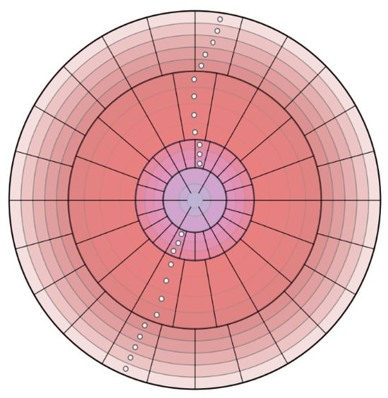 Figure 2 illustrates a concentric zone model applied to 3D point clouds. The space is divided into polar segments with varying resolutions based on the radial distance from the sensor. Specifically, the model partitions the space into distinct zones, which are further subdivided into X concentric rings. Each ring corresponds to an annular region defined by two radii, and . Additionally, each ring is segmented into angular sectors determined by azimuthal and polar angles in spherical coordinates. Furthermore, the coordinates which define the prior geometric knowledge from regions previously traversed by the robotic platform are represented as white points in Figure 2. This knowledge contributes to the identification of traversable terrain properties by means of historical navigation data. Coordinate transformations are facilitated by the global reference frames associated with each point cloud, which are obtained through classical algorithms such as the Iterative Closest Point (ICP) or visual odometry. Specifically, positions, , are projected into the current sensor frame, L, via Equation (1). This equation represents the homogeneous transformations applied to positional data measured in a global reference system, G, to a local system, L. The matrix is the homogeneous transformation matrix that allows the transformation of coordinates from the global system to the local system. The coordinates of the positions, j, expressed in the global system G are denoted as .