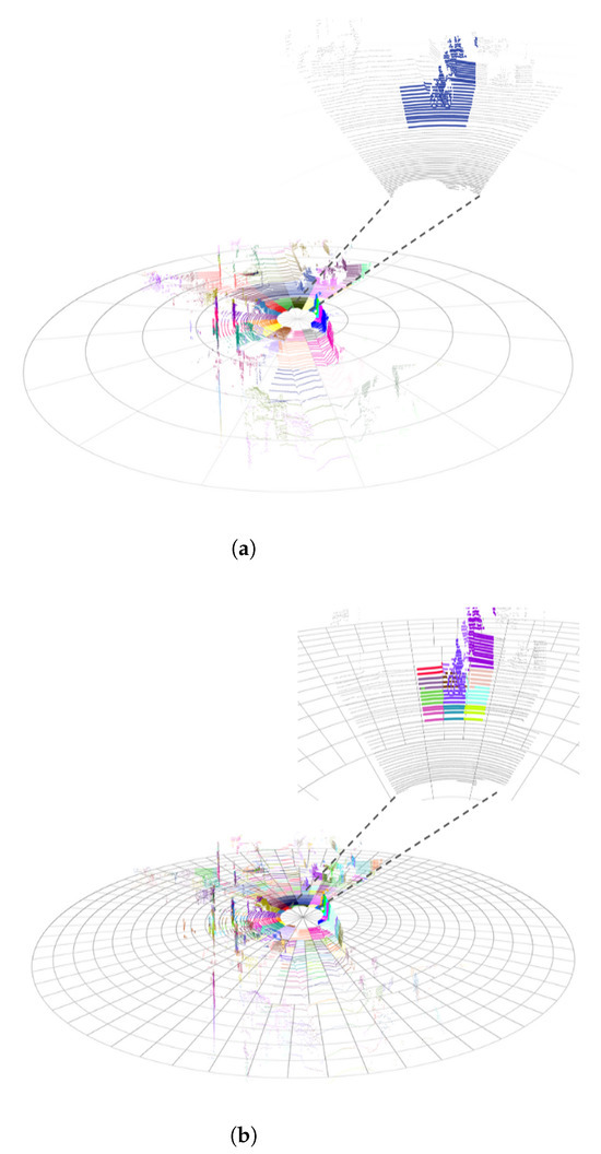 - Sparse data ambiguities are present in sectors with minimal point density (e.g., distant regions). There is an absence of sufficient data for reliable PCA-based feature extraction (Equation (3)).