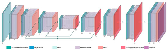 As previously stated in Section 2.4, sparse convolutional neural networks are becoming the most predominant approach to process point clouds in recent years. Thus, given any point cloud, B, a sparse vector S is defined according to Equation (6), as a set of coordinates, , describing the cloud after applying a part-integer function and a scaling factor, v, that determines the degree of discretization of the space. Furthermore, the sparse vectors enable the storage of feature vectors, , associated with all the discretized spaces represented. The calculation of these values is derived from the weighting of the feature vectors, , of each point that is encompassed in a discretized space, . The processing of the input data is carried out using the Minkowski Engine library (https://github.com/NVIDIA/MinkowskiEngine, accessed on 3 April 2025) [52].