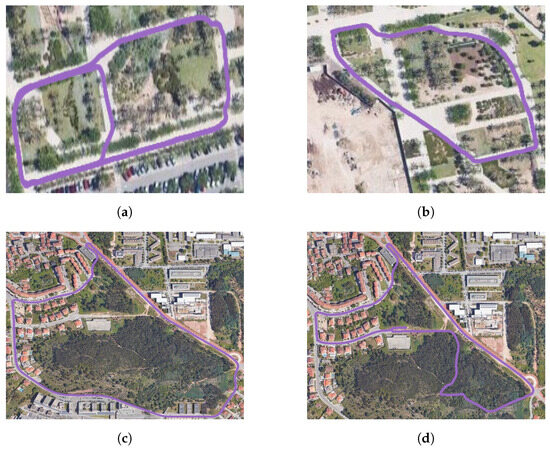 Figure 5. Representation of the data collected. (a,b) Traversed environments within the University of Elche campus. (c,d) Environments captured within the city of Coimbra. The trajectories followed are colored in purple