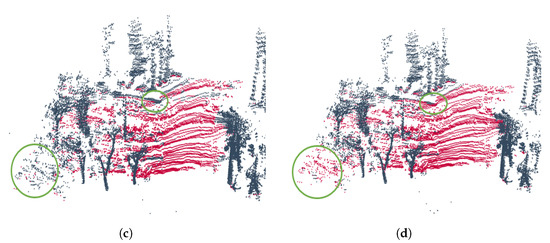 Results of the UMH-Gardens experiment. (a) Point cloud labeled using the pure geometric method from the UMH-Gardens dataset on the trajectory shown in Figure 5a. (b) Point cloud labeled using the hybrid method from the UMH-Gardens dataset on the trajectory shown in Figure 5a. (c) Point cloud labeled using the pure geometric method from the Coimbra-Liv dataset on the trajectory shown in Figure 5b. (d) Point cloud labeled using the hybrid method from the Coimbra-Liv dataset on the trajectory shown in Figure 5b. The points classified as ground are represented in