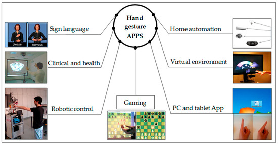 Hand gesture recognition is an essential part of HCIs and is an important topic in computer science. The main aim of hand gesture recognition is to interpret the meaning conveyed by the hand’s location and posture [5]. Hand gesture recognition has applications in many different fields and is used in gaming, IoT devices, virtual reality (VR), augmented reality (AR), robotics, sign language interpretation, assistive technologies, sports activity assistance, underwater rescue, firefighting assistance, etc., as shown in Figure 1 [6,7,8,9].