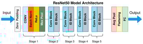 The ResNet50 model has 50 layers and is a member of the ResNet (Residual Network) family [33]. It is renowned for its creative application of residual connections, which aid in resolving the “vanishing gradient” issue that deep neural networks frequently face [34]. The ResNet50 model is easy to employ for transfer learning or fine-tuning in specific applications because it can be used in a variety of deep learning systems. Because it achieves an acceptable balance between computing efficiency and depth, it is one of the most frequently used models in deep learning for image recognition tasks. Figure 8 shows the design of the ResNet50 model.