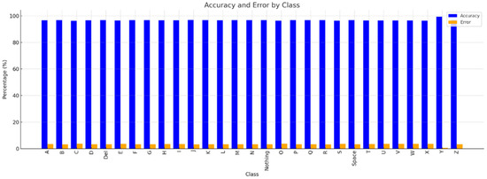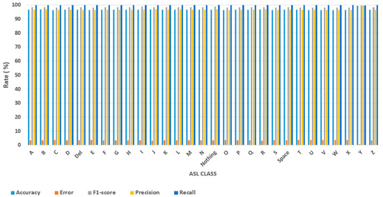 The model’s excellent overall performance is demonstrated by its average metrics for all gestures. The average values of accuracy, F1-score, precision, and recall are 96.69%, 98.35%, more than 96%, and 99.98%, respectively. The durability of the proposed method in managing the complexity and variability of an ASL dataset is demonstrated by its elevated averages over all measures, as illustrated in Figure 12. For real-world applications, such as interpreting sign language systems, the model’s ability to maintain near-perfect recall demonstrates its dependability in gesture recognition tasks. All classes have a continuously low average error rate of 3.31%, with no exceptions indicating noticeably poor results. This shows that there are no notable biases in the model’s generalization across the dataset. Each gesture has a low error rate, often between three and four percent. The approach achieves balance in reducing False Positives and False Negatives, as evidenced by the average precision (96.71%) and recall (99.98%) values. Nonetheless, slightly reduced accuracy and slightly increased incidence of error for some gestures (such as “O” and “L”) indicate some difficulties in differentiating these motions in specific cases. A balanced F1-score metric was obtained, with rates exceeding 98% across every motion. Moreover, the method was equally effective in every class. The effective reduction in False Positives and False Negatives is demonstrated by balanced performance across all measures.