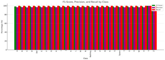 In terms of class-specific observations, Class “Y” performed the best, with an accuracy of 99.40%, precision of 99.70%, recall of 99.68%, and an F1-score of 99.69%, as illustrated in Figure 12. This shows that the model maintained a low number of False Positives (high precision) and accurately detected nearly all cases of gesture “Y” (high recall). The capacity of the model to achieve an excellent equilibrium between precision and recall is demonstrated by the highest F1-score in the dataset, 99.69%, for gesture “Y”. Additionally, gesture “Y” has the lowest error rate—just 0.6%—indicating that the model is quite dependable at identifying this gesture. This means that the best performance was achieved for the motion “Y”, showing that the model has mastered recognizing the gesture. A few potential explanations for this include improved feature descriptions for this gesture and distinctive visual qualities in the dataset that the model can readily distinguish from others. Additionally, the accuracy of some classes, including “X” and “S,” is comparatively lower (96.40% and 96.41%, respectively), as shown in Figure 13. This could indicate that some properties overlap with those of other motions, which would result in somewhat greater error rates. Although the majority of classes display recall values of 100%, categories like “L” and “Nothing” deviate marginally from this tendency, with recall ratings of 99.86% and 99.90%, respectively, as shown in Figure 14. This could occasionally result in misclassification because of the similarity in hand shape or orientation.