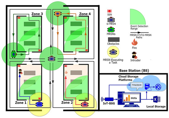 - The sensor nodes in each zone space contain non-imaging fire and intruder event detection sensors. The zone SSNs detect events and communicate the data to the O-SSN of the zone-assigned MRSN. The O-SSN relays the detected events to the BS via the IoT-BSG. For enhanced reliability, redundant communication protocols are implemented to prevent data loss during transmission. Additionally, the O-SSN of each G-MRSN detects and communicates its data to the BS via the IoT-BSG.