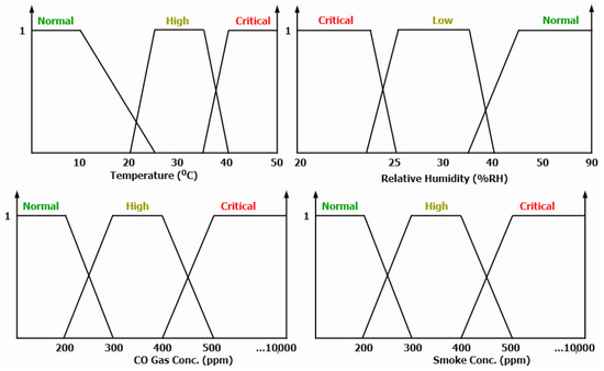 The sensor nodes’ event classification system involves a fuzzy logic decision-making algorithm for the analog sensors (T/RH, CO gas, and smoke) combined with the digital inputs of the digital sensors (flame and motion). A fuzzy set was generated for each analog sensor, comprising three member functions (MFs)—standard, high, and critical. The fuzzy set diagrams and MFs are shown in Figure 4.