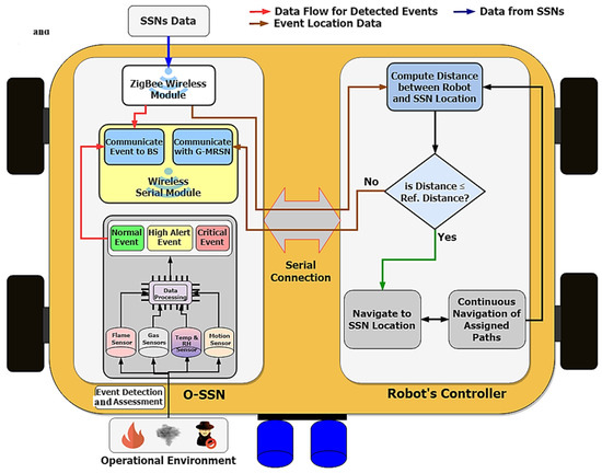 - Distributed WSNs. Each consists of static IoT-based sensor nodes (SSNs) and an onboard SSN (O-SSN) attached to each mobile robot. These WSNs can detect events and collect, analyze, and communicate data.