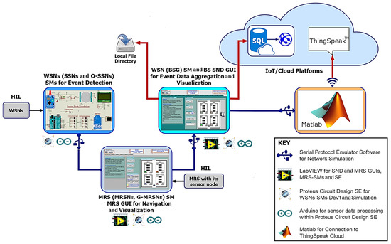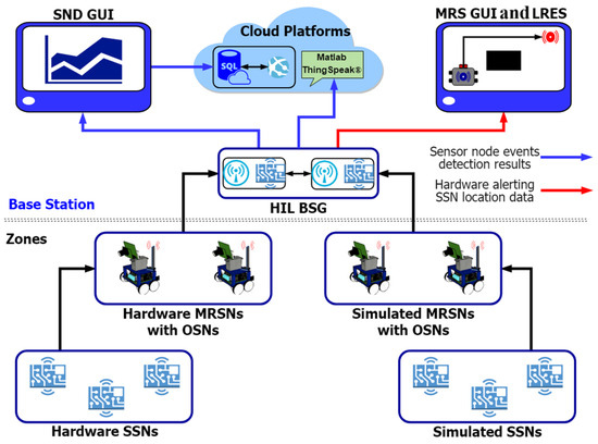 The IoT-based hybrid ANR system architecture is the framework upon which the principal conceptual design of the system with its various components is developed and interacted with to meet the system’s operational structure. As shown in Figure 2, the system architecture features the core development environments comprising the BS GUIs and IoT/cloud platforms, which can exchange data either with components from the simulation environments only, the physical environments only, or HIL test cases. The architectures of sensor nodes (SSNs and O-SSNs), robots (MRSNs and G-MRSNs), and the BS are presented.