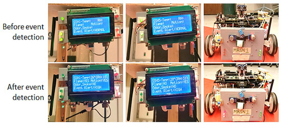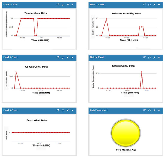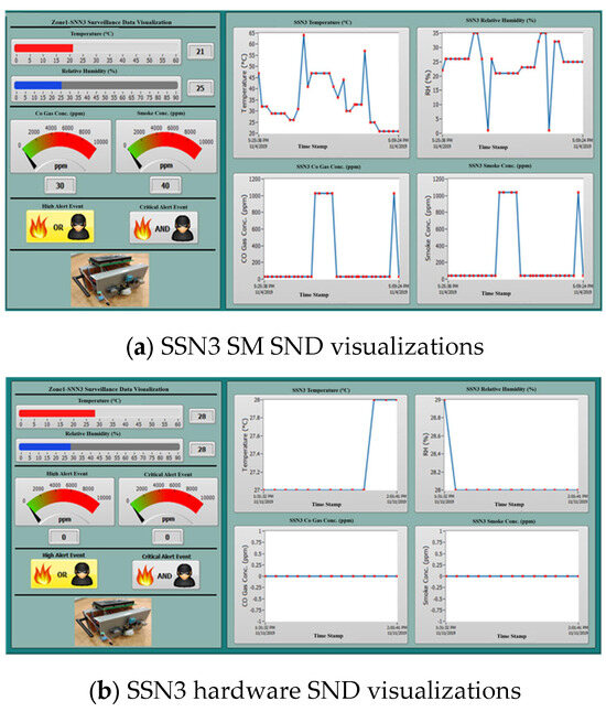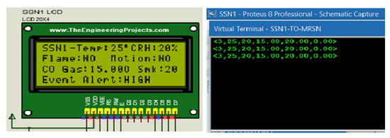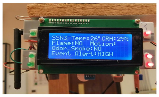 The IoT-based SSN and O-SSN structures are based on the generic sensor node structure [43]. The SSN comprises analog sensors: gas (carbon monoxide—CO and smoke) and temperature/relative humidity (T/RH) sensors, and digital sensors: flame and motion sensors standard to both SSNs and O-SSNs. Also, the SSNs contain the ZigBee communication interface and LCDs and LEDs for event display.