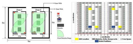 - The mobile robots assigned to the zones can coordinate, plan, and navigate paths to the known SSN locations when emergency alerts are issued by any of the SSNs of the relevant zone. To improve response times, mobile robots utilize real-time decision-making models for task prioritization during emergencies. When there is no such emergency, the robot regularly navigates a defined assigned path within/around its zones and spaces.