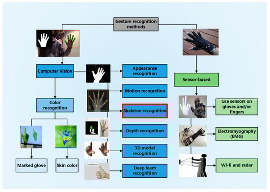Sign and movement recognition methods are varied and very interesting. As mentioned in the previous section, they are divided into two main groups: those based on electronic devices (sensors), including rehabilitation and/or prosthesis works, and those recognizing gestures using computer vision.