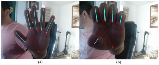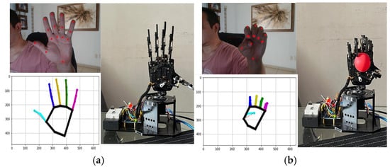 The proposed project aims to implement a hand gesture and movement recognition system based on computer vision in communication with a robotic hand, which can replicate the detected gestures through image processing. The system detects and recognizes the user’s movements, sending the corresponding commands to the robotic hand to reproduce the identified gesture, basic movements such as opening and closing the fingers, and other more complex movement patterns. A webcam connected to the system was used for video capture, and a 78-degree monocular camera was used for gesture recognition. The video setup was configured with a frame rate of approx. 24 p/s to ensure smooth and real-time detection; hand detection was carried out using the MediaPipe hand detection model. This model allows for identifying and tracking landmarks on the hand, including the phalanges of the fingers and wrist. The model’s configuration was tuned to maximize detection accuracy while maintaining a balance with processing speed. As the video is captured, frames are processed to extract the coordinates of the hand landmarks in real time. The positions of the finger phalanges and wrist are recorded in pixels, normalized to the size of the captured frame. The extracted landmarks were visualized in real time on the captured video). Superimposing colored circles achieved this at the corresponding locations in the frame. In addition, the positions of the landmarks were plotted, allowing a clear visual interpretation of the hand movements, as shown in. Figure 2.