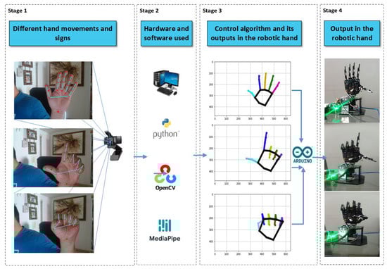 Hand movement data were sent through a serial port for communication with other systems. A serial connection was established at 115,200 baud, ensuring efficient, real-time transmission of the recorded data to complement the data capture. The process was run continuously, allowing the constant capture and visualization of hand movements. Adequate pauses were implemented to ensure system stability and prevent data overflow in the transmission. This comprehensive approach enables the robotic hand to replicate the movements detected in real-time accurately. Signal smoothing and dimensionality reduction techniques guarantee a robust system capable of adapting to different capture conditions and variations in the user’s movements while maintaining accuracy in the reproduction of gestures. The system design is based on integrating hardware and software components, and its workflow is presented in the system block diagram in Figure 3.