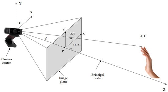 The pinhole camera model is essential in computer vision as it describes the projection of a three-dimensional object onto a two-dimensional plane (image). This idealized model assumes a camera where light passes through a small hole, forming an inverted image on the sensor or film. The pinhole model describes the mathematical relationship of projecting points in 3D space onto an image plane. Let the center of projection be the origin of a Euclidean coordinate system and the Z-plane, which is called the image plane or focal plane. The center of projection mapping from 3D world space to 2D image coordinates using a human hand is shown in Figure 4.
