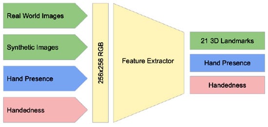 - Zhang, F.; Bazarevsky, V.; Vakunov, A.; Tkachenka, A.; Sung, G.; Chang, C.-L.; Grundmann, M. MediaPipe Hands: On-device Real-time Hand Tracking. arXiv 2020, arXiv:2006.10214. [Google Scholar]