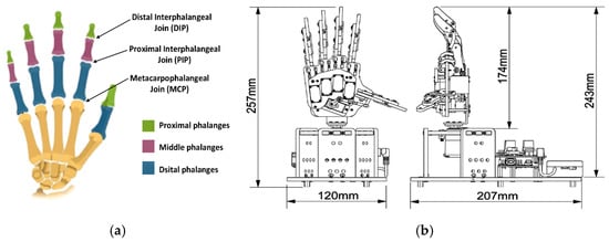 The human hand comprises five fingers: the thumb and the index, middle, ring, and little fingers. Each of these fingers, except for the thumb, consists of three bones: the distal phalanx (DP), intermediate phalanx (IP), and proximal phalanx (PP). The thumb, however, has only two: the distal phalanx and the proximal phalanx. The connections between these bones, known as joints, include the distal interphalangeal (DIP), proximal interphalangeal (PIP), and metacarpophalangeal (MCP) joints. There are approximately 27 joints in the hand, including the wrist joint, as shown in Figure 6a. These joints allow the hand to flex when the muscles contract. Each finger is controlled independently, allowing specific movements to be performed on the fingers of the robotic hand [49,50]. See Figure 6b.