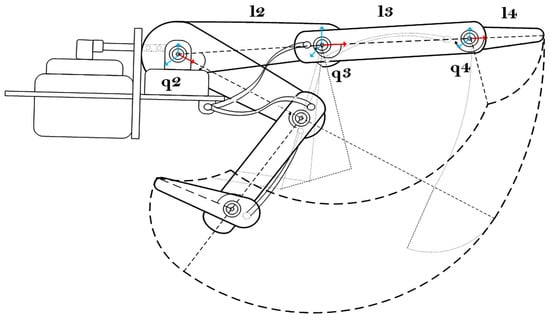 Its robotic counterpart controls movements by links and joints that emulate human phalanges and joints. For example, the L2 link in a robotic finger would be equivalent to the proximal phalanx in the human hand. At the same time, the MCP joint represents the rotation or pivot at the metacarpophalangeal (MCP) joint, referred to as q2 in robotic terms. Following this scheme, the PIP joint would be the analog of the proximal interphalangeal joint, controlled by q3, and the DIP joint, which corresponds to the distal interphalangeal joint, is controlled by q4. The illustration in Figure 8 shows how these movements are mechanically replicated in a robotic system, simulating a human finger’s joints and bone segments.