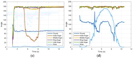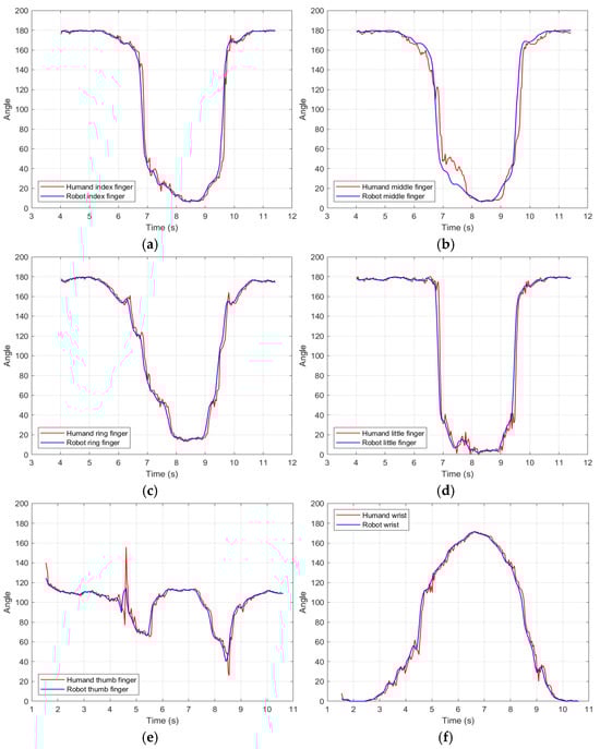In Figure 11a–f. We have six graphs comparing the bending/extension angles of human and robotic fingers (thumb, index, middle, ring, pinkie, and wrist) over time, followed by graphs comparing the movements of the human hand versus the robot hand.