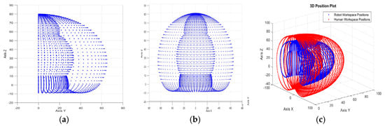Figure 12a–c below shows how the index finger of the side- and front-view robot moves in its 3D workspace. Figure 12c shows the index finger of the robotic version in blue versus that of the human version in red. Quantitative and qualitative experimental results that support the effectiveness of the computer vision-based control system are presented. It is noteworthy that Figure 12, matches the workspace in Figure 8.