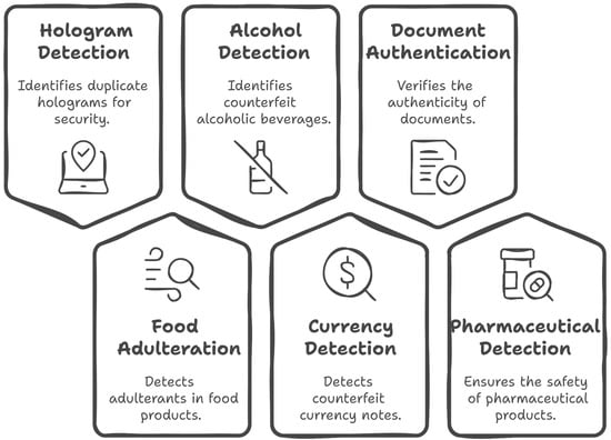 HSI has been shown to be a very effective technology for counterfeit detection across multiple domains, as shown in Figure 2. Mukundan et al. created a system that uses a Raspberry Pi camera and a Raspberry Pi 4 model B for the detection of counterfeit money [34]. It made use of the VIS-HSI technique, which created hyperspectral images from RGB images. Three samples of authentic 100 NTD Taiwanese currency notes were chosen, and the mean gray values (MGV) of two different regions of interest were compared with counterfeit 100 NTD notes. The findings indicated that the currency notes may be readily distinguished from one another using MGV, having a spectral range between 400 and 500 nm. Frosch et al. performed counterfeit testing and multicomponent concentration analysis of the anti-malarial tablets in the pharmaceutical industry [35]. This was performed using a Raman spectroscopy based on a fiber array by utilizing a wavelength of 532 nm in the visible range. Raman spectroscopy and Partial Least Squares regression (PLSR) modeling were applied to precisely measure multiple API concentrations in pharmaceutical tablets, effectively detecting counterfeit antimalarial drugs.