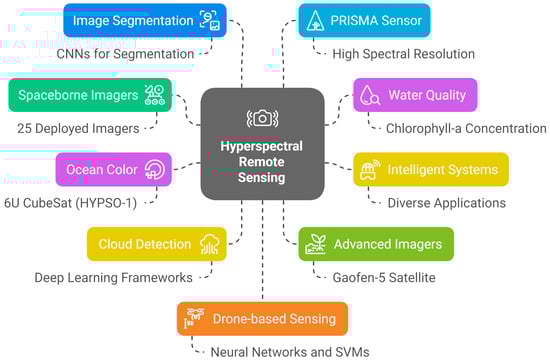 HSI is widely utilized in remote sensing to improve the ability to monitor and manage natural resources, as shown in Figure 3. Qian et al., in a survey on the development and evolution of space-borne hyperspectral imagers, found that at least 25 such instruments have been deployed around the globe [44]. The basic technologies used here involve dispersive elements, spectral filters, and Fourier transform interferometers. Among these, 19 are around Earth, while the six instruments are deployed for missions around the Moon, Mars, Venus, and comets. The wavelength covered by hyperspectral imagers mostly ranges from visible and near-infrared (VNIR) to short-wave infrared (SWIR), carrying quite some detail in the spectral content. This diverse suite of instruments attests to advances in HSI technology and applications across the full spectrum of space exploration. Flores-Anderson et al. suggested a semi-empirical algorithm on the basis of the three-band model that could evaluate water quality through the concentration of chlorophyll-a in the water column. They calculated water surface reflectance from the hyperspectral spaceborne sensor Hyperion to relate it to in situ chlorophyll-a samples from Lake Atitlán. The above-mentioned algorithm, based on the 467 nm to 559 nm blue-to-green ratio bands, has been able to generate a relative error of 33% in modeling chlorophyll-a. This proves that hyperspectral data are much more effective in representing water quality parameters, although the limitation associated with higher concentrations will be corrected in future calibration with multispectral sensors [45].