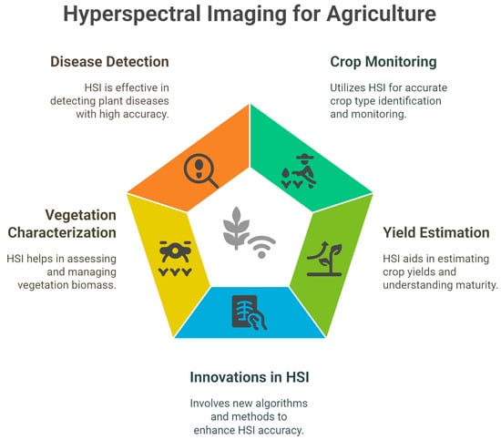 HSI has found great application in agriculture for advanced crop monitoring, disease detection, and yield estimation as shown in Figure 4. For instance, Wang et al., evaluated satellite hyperspectral (Orbita) and multispectral (Gaofen-1) data in the process of monitoring cotton in China [54]. It was shown that Orbita hyperspectral data presented slightly higher values of spectral reflectance and classification accuracy than Gaofen-1 multi-spectral data, and hence, it was more capable of detailed crop monitoring. Another study by Agilandeeswari et al. discussed crop classification for agricultural purposes using HSI. They obtained very high accuracy rates in classifying the different crop types, specifically corn, soybeans, and wheat, thus exemplifying success in precision agriculture with HSI [55].