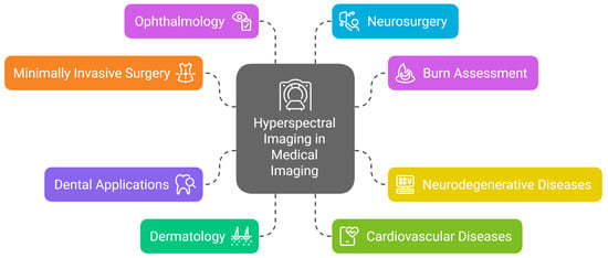 HSI is quickly evolving as a medical technology with the development of novel techniques for non-invasive diagnosis and surgical procedures in recent years, as shown in Figure 5. Numerous fields, including dermatology, ophthalmology, cardiovascular illness, and neurodegenerative diseases, have found success with it.