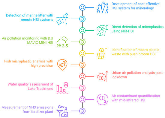 HSI has turned out to be one of the most important tools in environmental monitoring as it provides very precise and non-invasive methods for analyzing ecosystems, as shown in Figure 7. Since HSI covers a large range of wavelengths, it enables the accurate detection of pollutants, microplastics, and atmospheric/marine conditions. Applications range from air and water quality monitoring to the identification of marine litter and soil and mineral analyses.
