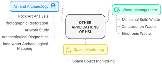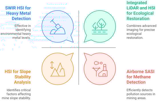 HSI can, to a large extent, be used for effective restoration of ecology, mineral exploration, and environmental monitoring in the mining sector, as shown in Figure 8. These works indicate the viability of HSI in the noninvasive and efficient detection of heavy metals, mineralogical variables, and ecological disturbances for many applications in the mining-related industry.