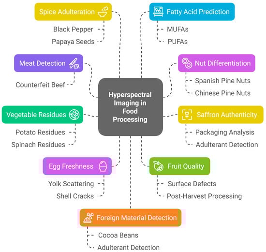 HSI is used in the food processing industry due to its noninvasive and non-destructive properties. It can detect contaminants and identify the differences in food quality and authenticity, as shown in Figure 10.