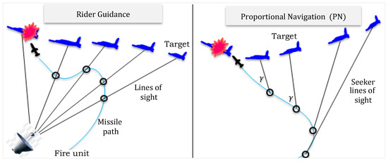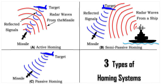 A guidance system is called homing (see all types in Figure 3) if the missile detects the target and tracks it thanks to the energy emitted by the latter. If the source of the energy is the target , e.g., radio transmissions, acoustic noise, or heat, the homing is called passive. If reflects energy beamed at it by , then this is active homing. In semi-active systems, homes onto energy reflected by , the latter being “illuminated” by a source I external to both (see [19,33,47]). The expression homing guidance is used to describe a missile system that can sense the target by some means and then guide itself to the target by sending commands to its own control surfaces. Homing is useful in tactical missiles where considerations such as autonomous operation usually require sensing of the target motion to be performed from the interceptor (pursuer) itself [48].