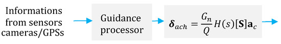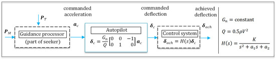 The autopilot is a link between the function that indicates a change of heading is needed (guidance processor) and the mechanism that can change the heading (control system). The “autopilot” receives guidance commands and processes them to the controls such as deflections or rates of deflection of control surfaces or jet controls. The control subsystem transfers the autopilot commands to aerodynamic or jet control forces and moments to change the position of the airframe and to attain the commanded maneuver by rotating the body of a missile to a desired angle of attack [42] (see Figure 4). The design of the autopilot depends on the aerodynamics and the type of controls employed.