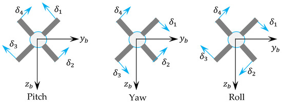 is the achieved angle of attack of pitch channel control surface . is the achieved angle of attack of yaw channel control surface . The fin angles of incidence are calculated using the equations and . The absolute values of and are tested against the maximum fin deflection angle ; if the absolute value of a fin angle of incidence exceeds , it is reset to and retains its original sign (see [43,46]).