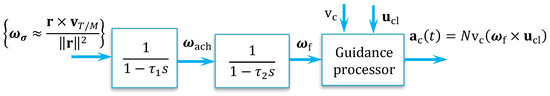 Generally, the servomotors are modeled by the first-order transfer function given by . The closed-loop transfer function is given by , where is the control system time constant depending on the type of motors and is some proportionality constant. Figure 8 illustrates the missile guidance and control loop depicting the interaction between the guidance system, control laws, and the missile’s dynamics. This closed-loop system ensures that the missile follows the desired trajectory to intercept the target effectively.