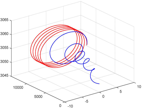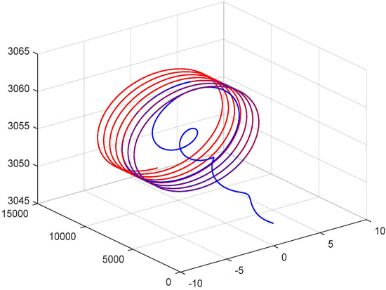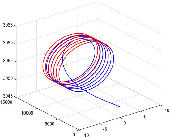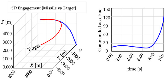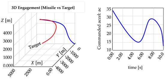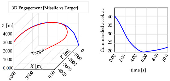 The target acceleration vector is calculated using , where is the angular rate vector of the target flight path, . The weaving flight path can be modeled as a cosine curve: , where is the max-maneuver acceleration. is the commanded target maneuver acceleration. is the period of target wave maneuver, , and is the time since starting the maneuver, . To avoid the discontinuities in the commanded target acceleration, we pass through a first-order transfer function (low-pass filter) before using it in a digital simulation [41]. The following steps summarize the curved path for target maneuver: