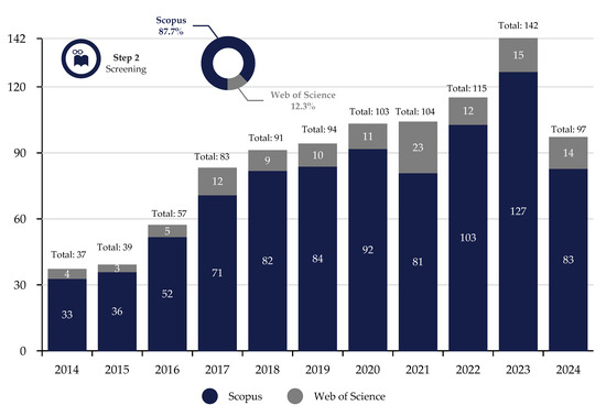 Of the 991 studies initially evaluated, only 962 successfully passed the screening phase. A binary assessment was conducted independently by the research team. Articles were approved only if they met all five predefined inclusion criteria. The historical evolution of studies in this field, presented in Figure 2, reveals a clear upward trend in research contributions over the past decade. From 2014 to 2016, publication numbers remained relatively low, with fewer than 60 studies per year. However, a notable increase was observed from 2017 onward, with a peak in 2023, where 142 studies were published. The consistent rise, particularly in the last five years, suggests growing academic and technical interest in the transition of island power systems to 100% renewable energy. The fluctuations in 2021 and 2024, with slight declines, could indicate variations in funding availability, shifting research priorities, or delays in publication cycles. The increasing engagement from prestigious databases such as Scopus and WoS highlights the expanding recognition of this field within the scientific community. This trend reveals the urgency and relevance of addressing renewable energy integration, grid stability, energy storage solutions, and policy frameworks in insular contexts. The growing volume of literature reflects both advancements in technology and a heightened policy focus on sustainable energy transitions. The 962 studies that passed the screening phase will now undergo a more in-depth analysis in the following stage to extract valuable insights and synthesize the main contributions to the field.