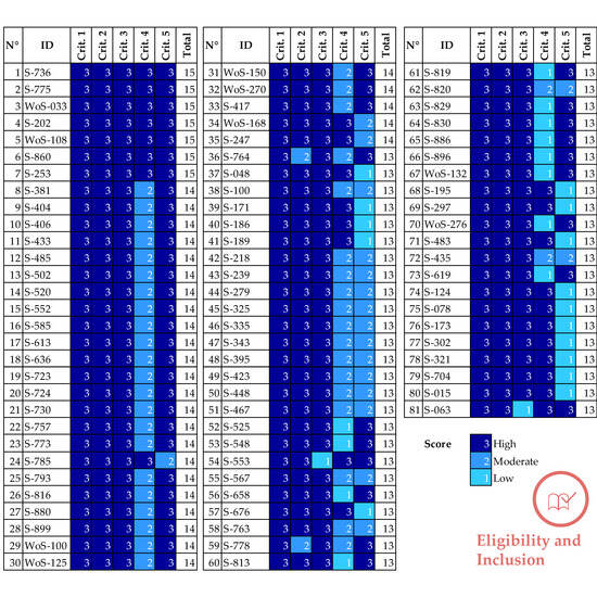 Each article underwent a detailed full-text evaluation based on a structured three-level scoring system. Two independent reviewers assessed the studies thoroughly, applying predefined criteria to maintain objectivity and minimize bias. When discrepancies arose in their evaluations, they engaged in structured discussions to reach a consensus. Figure 3 presents the verification matrix used in this phase, where each study was evaluated according to specific criteria and assigned the mentioned score ranging from 1 to 3. To guarantee the inclusion of only the most relevant and methodologically sound studies, the researchers established a minimum threshold of 13 out of 15 points. This benchmark ensured that selected works demonstrated a strong connection to the research focus, robust methodology, originality, and reliable data analysis. Studies that did not meet this threshold were excluded, not due to a lack of scientific merit, but because they did not align closely enough with the specific objectives of this review as measured by the eligibility criteria. Following this selection process, the 81 studies shown in Figure 3—representing 8.4% of the 962 screened—were included in the final review.