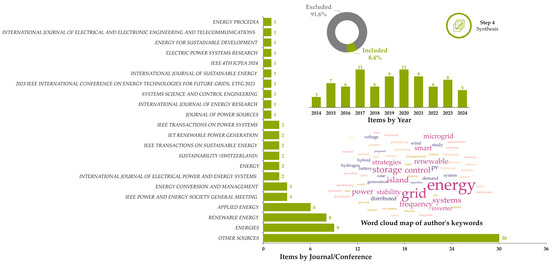 The analysis of publication trends over the years further shore up the scientific relevance of this topic. Despite the narrowing process inherent in systematic reviews, the number of selected studies per year remains relatively stable, with peaks in 2017 and 2020, where 11 studies were included in each year. Even in the most recent years, the dataset retains a strong representation, with eight studies in 2023 and five in 2024, demonstrating that research interest in this area remains high. The presence of multiple studies across the past decade, even after applying strict eligibility criteria, highlights the sustained academic engagement in renewable energy transitions for island power systems.